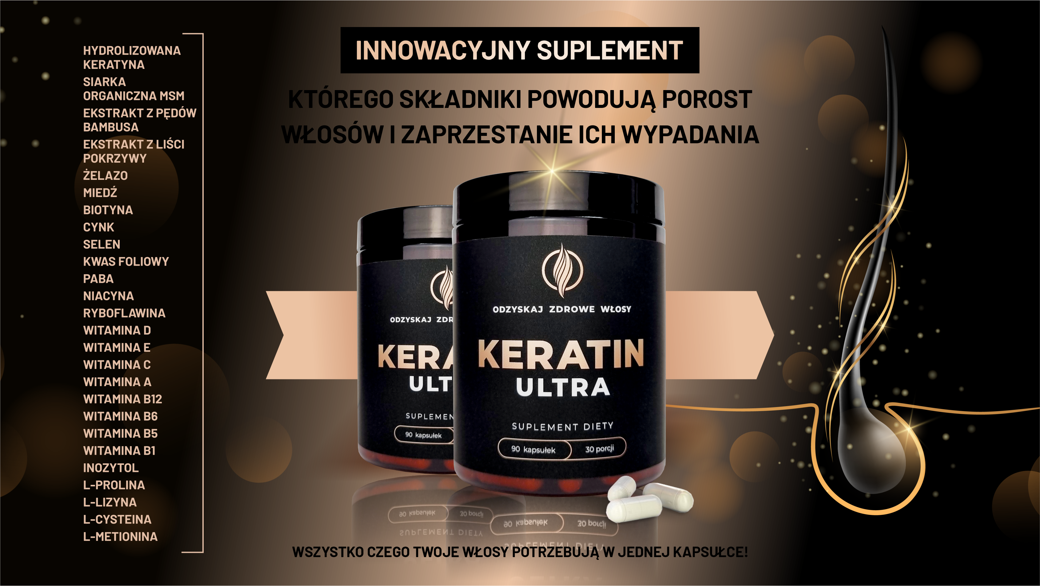 Tak, obecnie jest tylko jeden taki suplement na rynku. Nazywa się Keratin Ultra. To nutrikosmetyk, który zawiera hydrolizowaną keratynę i aż 25 składników aktywnych, czyli wszystko czego włosy potrzebują w jednej kapsułce. Zamówić można tutaj