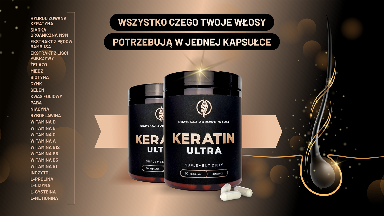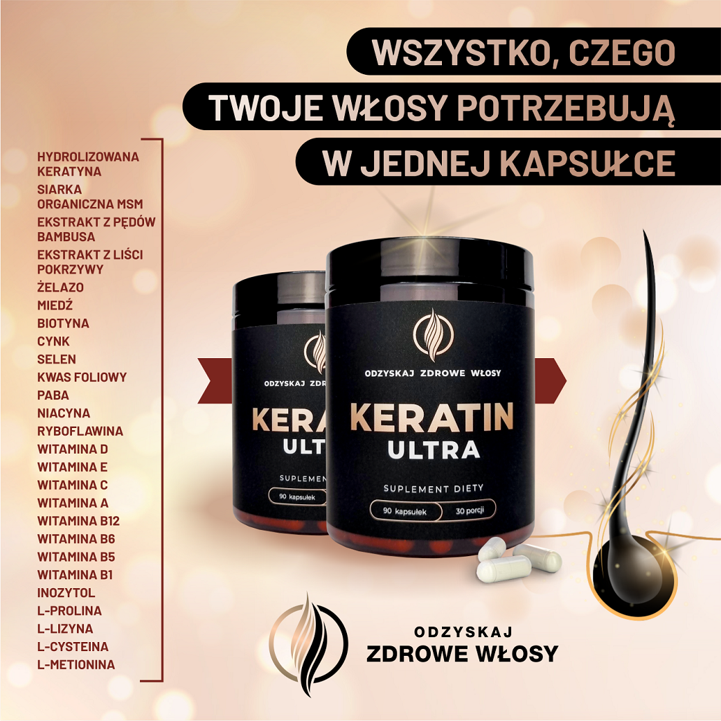 Odkryj suplement Keratin Ultra, który zawiera keratynę hydrolizowaną (białko będące budulcem włosów) oraz 25 starannie dobranych witamin i minerałów, przeznaczony dla kobiet i mężczyzn z włosami cienkimi, słabymi i pozbawionymi objętości, którzy chcą poprawić ich kondycję i wygląd!