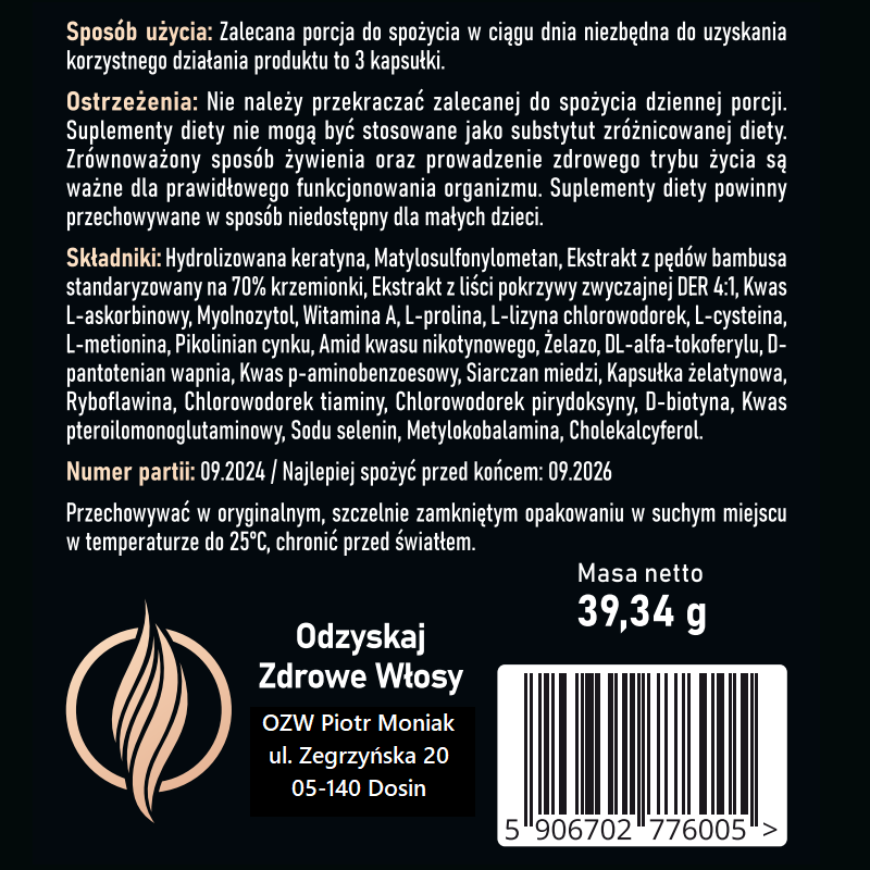Sprzedaż produktów marki „Odzyskaj Zdrowe Włosy” realizowana jest przez firmę „OZW” ul. Zegrzyńska 20, 05-140 Dosin, NIP 5222870885, posiadającą wpis do rejestru zakładów podlegających urzędowej kontroli organów Państwowej Inspekcji Sanitarnej prowadzonego przez Państwowego Powiatowego Inspektora Sanitarnego. Numer wpisu 183/008/2024.