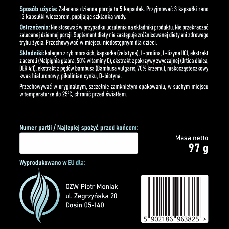 Pokrzywa to klasyczny fitokomponent stosowany w formułach ukierunkowanych na wygląd skóry i włosów. W Kolagen Ultra pełni rolę uzupełniającą i tonizującą — domyka profil składu, nadając mu zbalansowany charakter ukierunkowany na skórę głowy i jej otoczenie naczyniowe.
