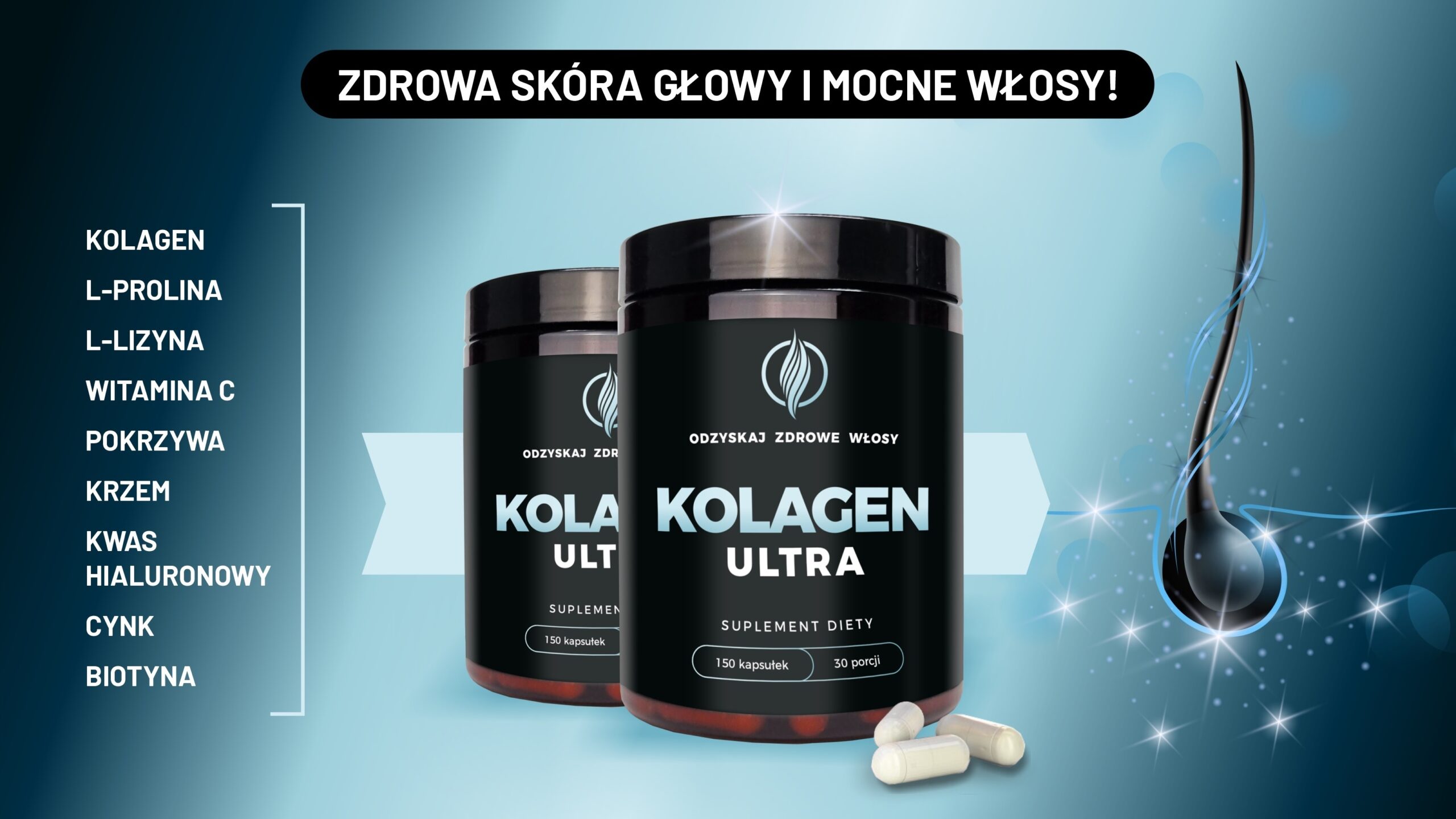 Kolagen to kluczowe białko macierzy zewnątrzkomórkowej skóry: typ I odpowiada głównie za wytrzymałość rusztowania, a typ III wnosi elastyczność i współtworzy strukturę ściany naczyń. Dostarczenie wysokiej porcji peptydów kolagenowych może wspierać budowę i organizację macierzy w skórze głowy, tworząc stabilne „podparcie” dla mieszków włosowych oraz sprzyjające warunki mechaniczne w strefie ich zakotwiczenia.